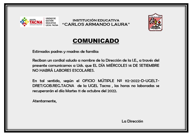 Comunicado: Feriado Recuperable 14 de Setiembre de 2022