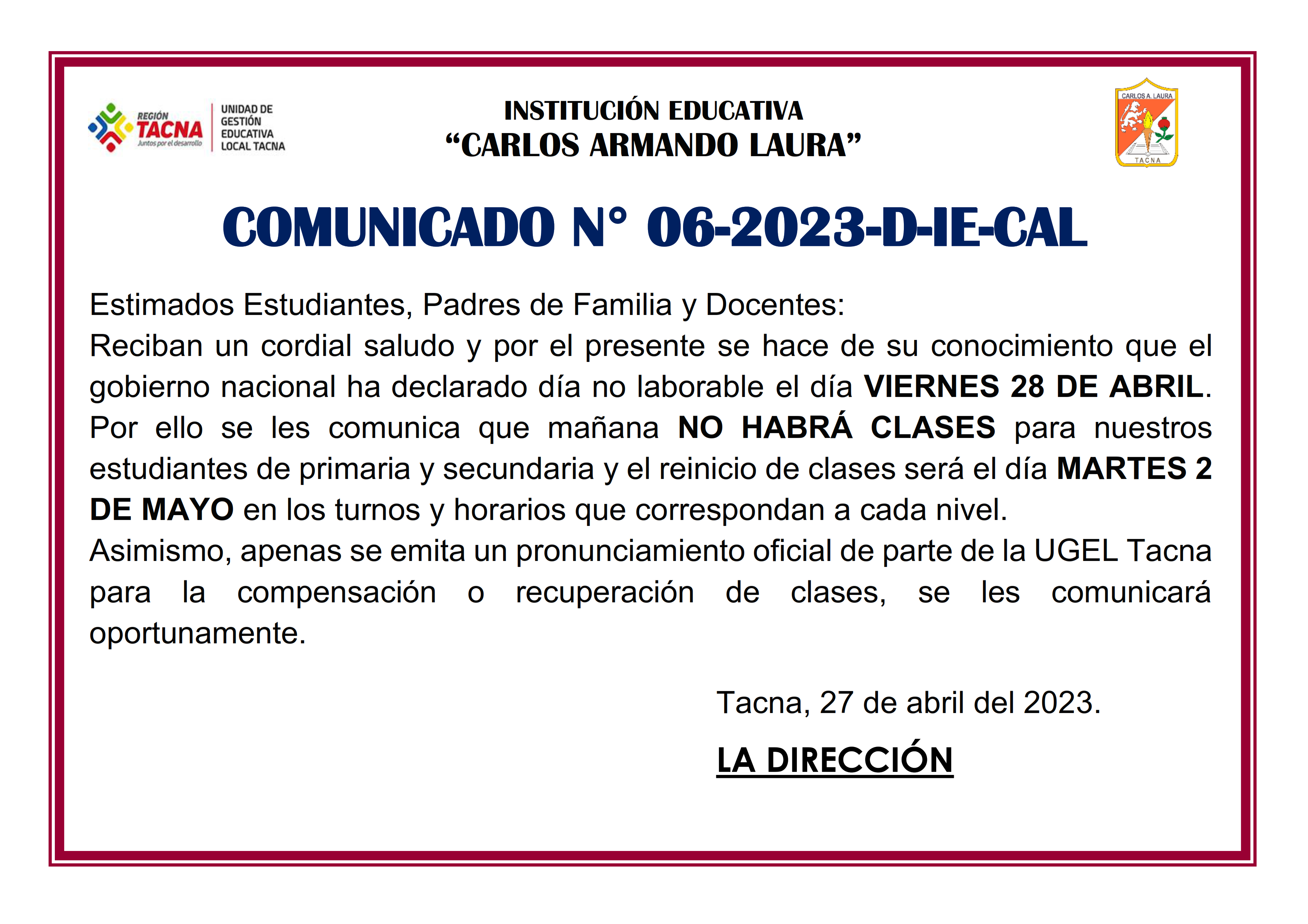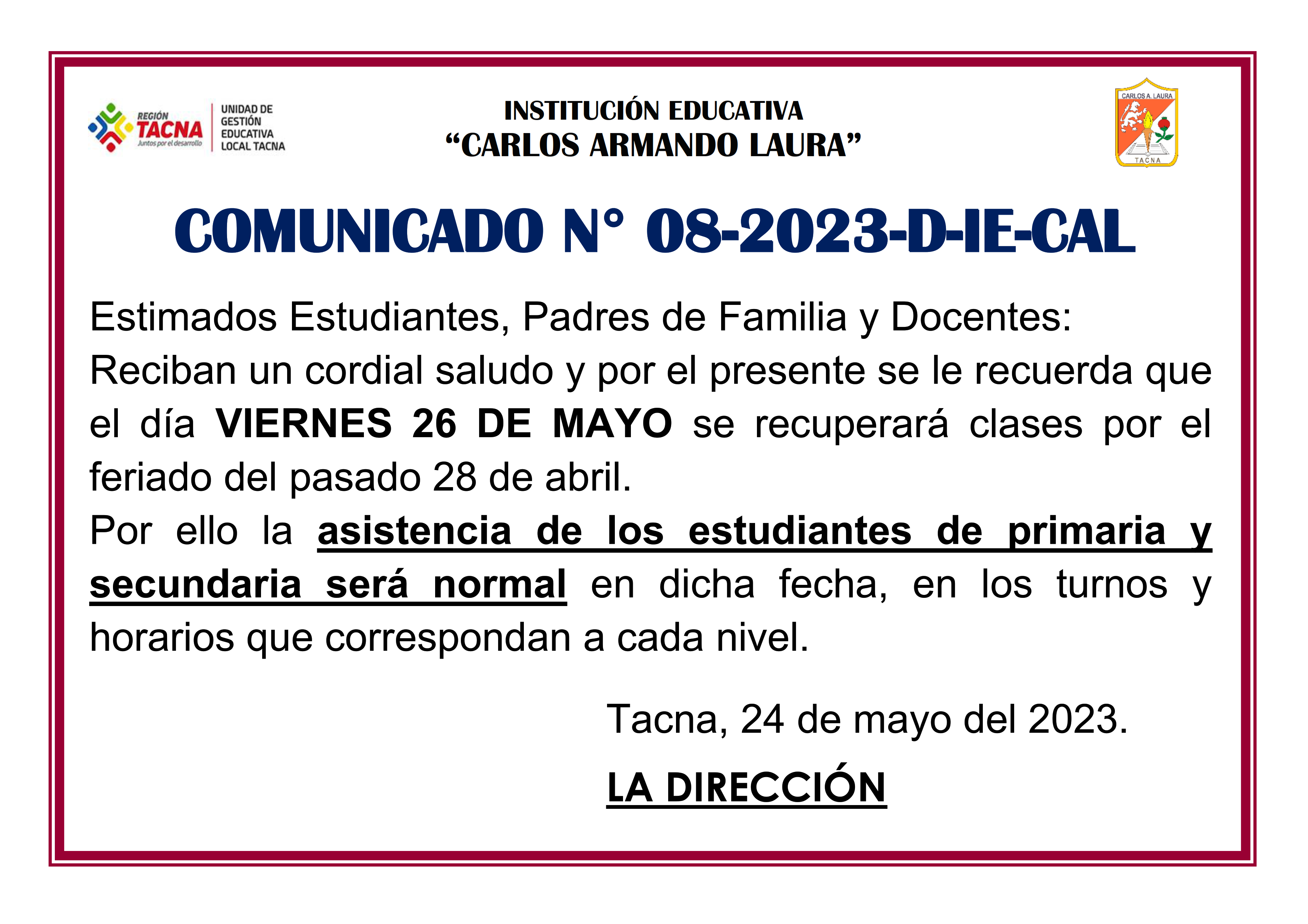 COMUNICADO Nro. 08-2023-D-IE-CAL "Recuperación de Clases Viernes 26 de Mayo del 2023"