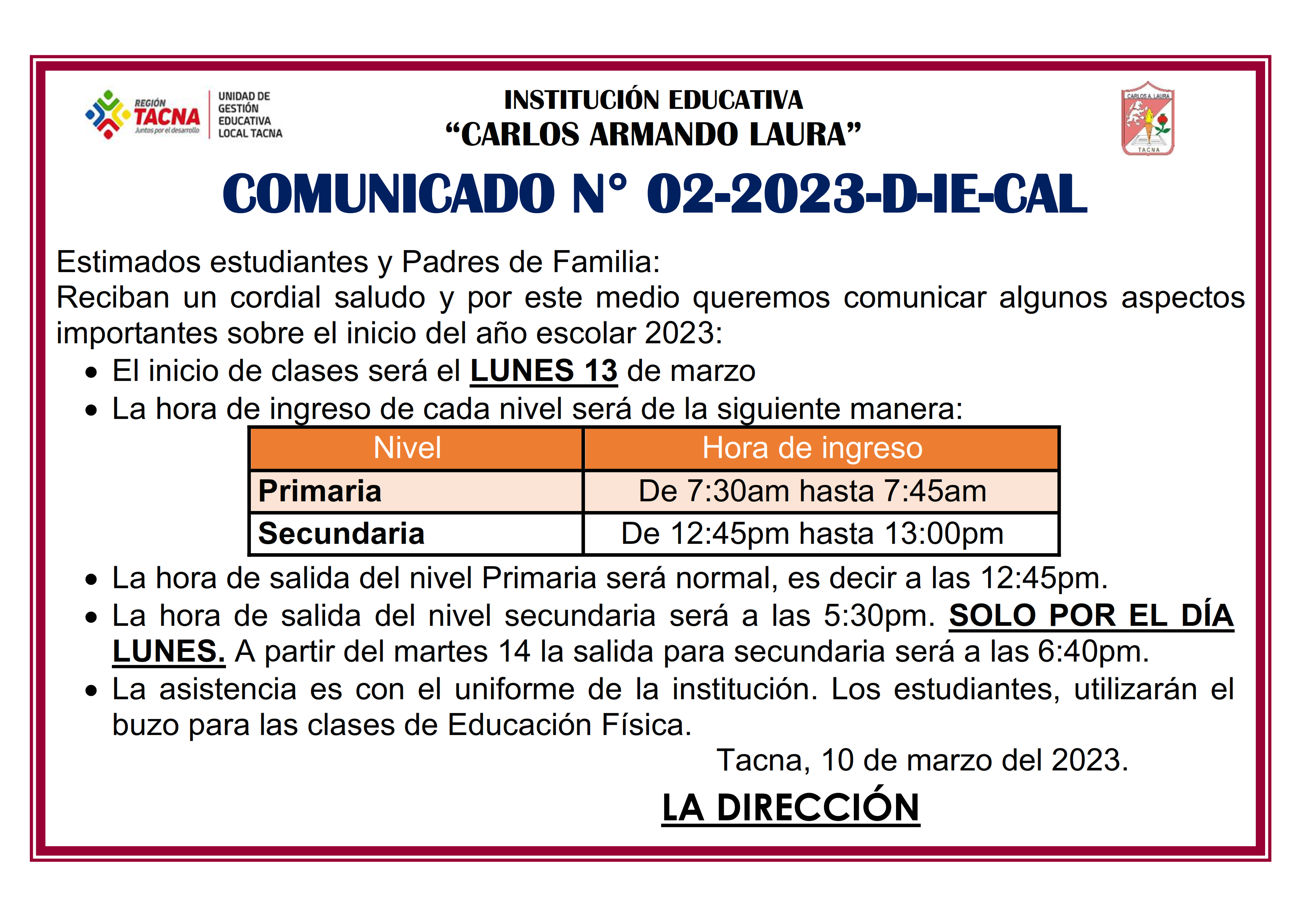 COMUNICADO: Inicio de Clases 13 de marzo de 2023