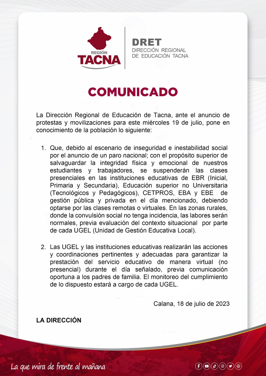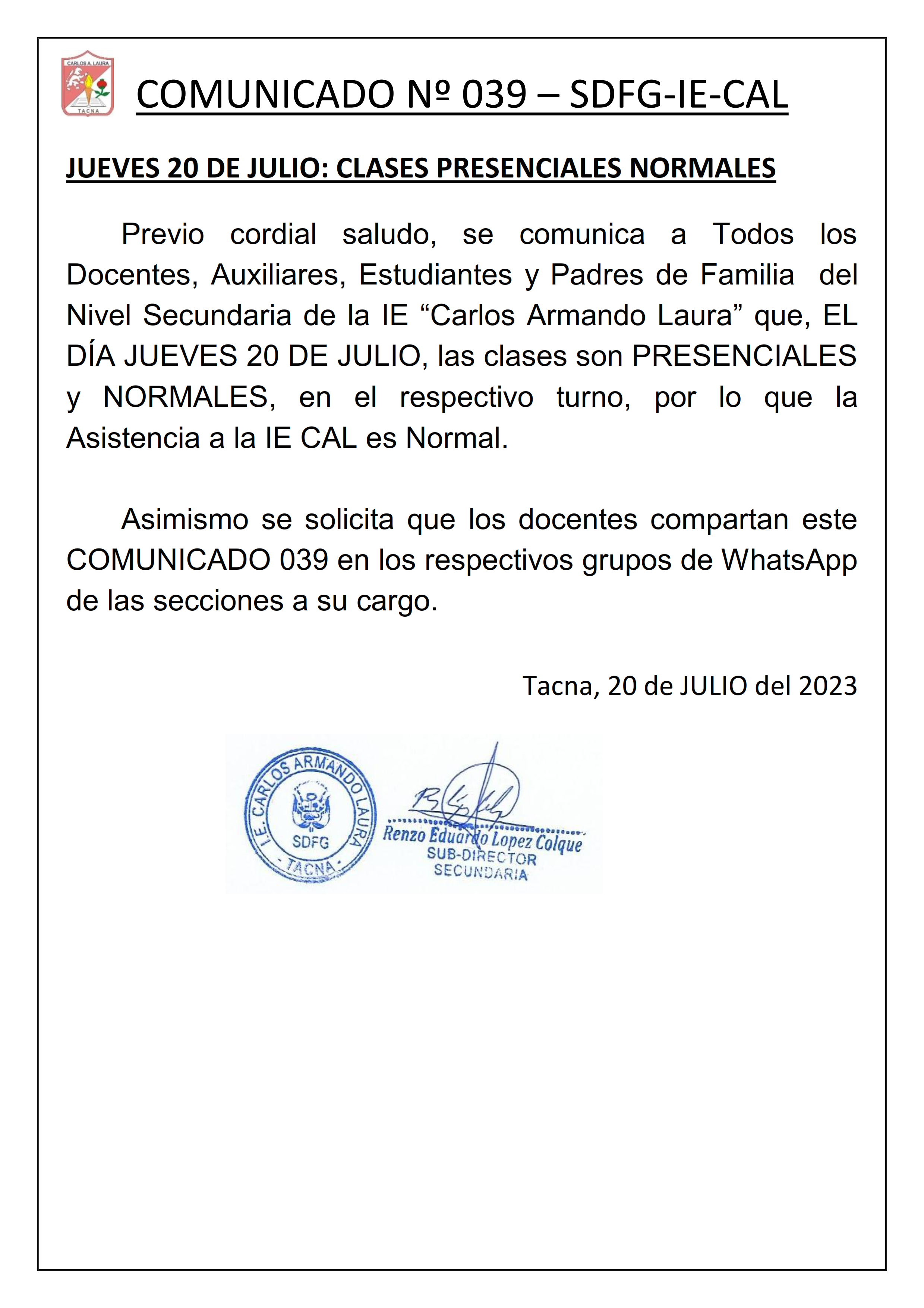 Comunicado: Clases presenciales jueves 20 de julio de 2023