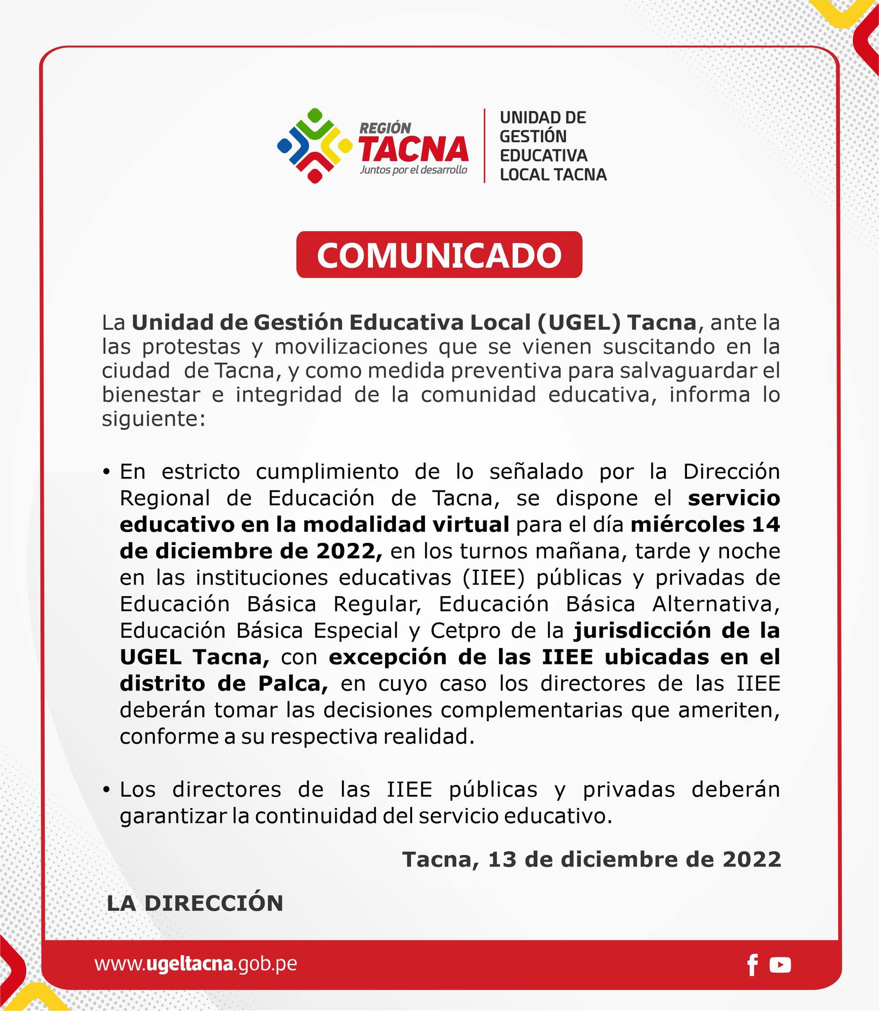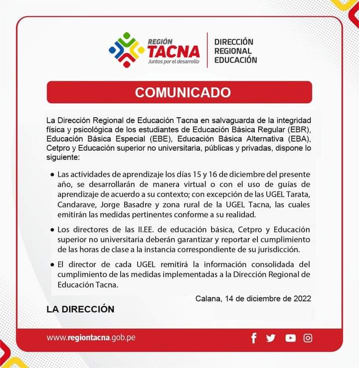 COMUNICADO UGEL - Jueves 15 y Viernes 16 de diciembre, clases virtuales en la ciudad de Tacna.